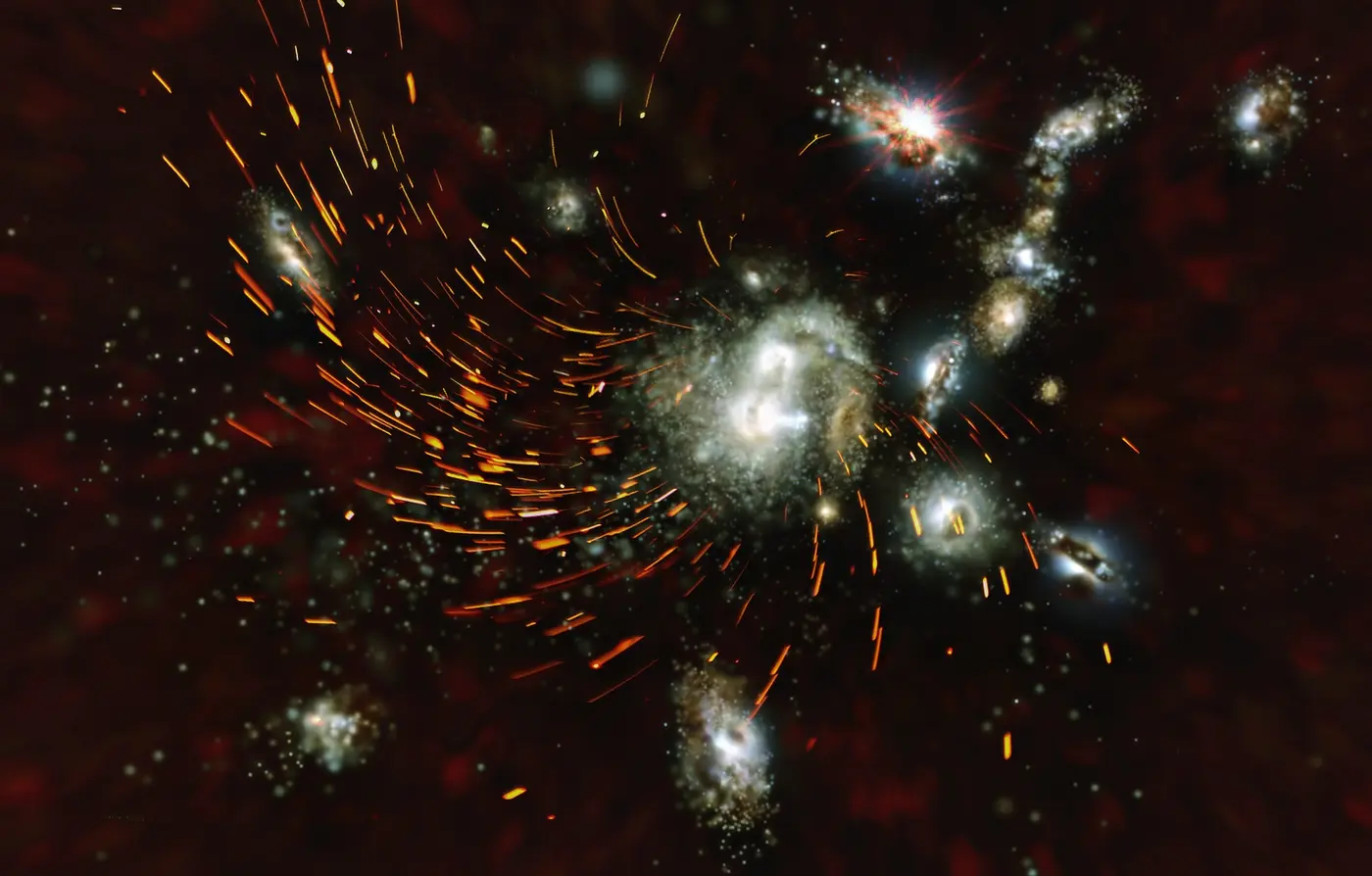Самое удивительное, что эти «бусины» приливных обломков связаны с цепочкой из двух десятков других сталкивающихся галактик на периферии коллапсирующей структуры. Это указывает на общее происхождение всех этих объектов и позволяет астрономам впервые наблюдать начало каскадной трансформации путем слияний. Согласно построенным моделям, большинство из 40 богатых газом галактик в этом ядре обречены. Они будут разрушены и сольются в единую гигантскую эллиптическую галактику менее чем за 300 миллионов лет — относительно недолго по космическим меркам.