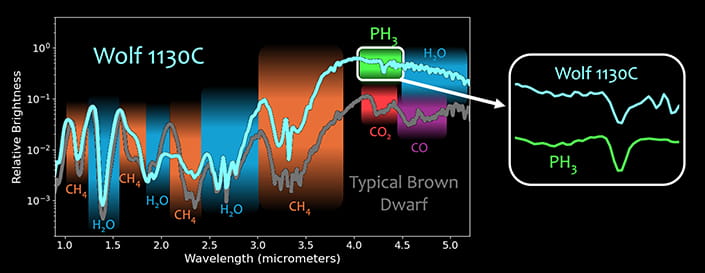 До запуска JWST теоретические модели предсказывали, что фосфин должен быть широко распространен в атмосферах газовых гигантов и коричневых карликов — объектов, занимающих промежуточное положение между планетами и звездами. Эти предсказания основывались на процессах турбулентного перемешивания, характерных для таких атмосфер. Однако наблюдения за другими экзопланетами и коричневыми карликами с помощью JWST не подтвердили ожидаемого обилия фосфина, что указало на пробелы в понимании химии фосфора. Ситуация изменилась, когда телескоп направил свои инструменты на систему Wolf 1130ABC, расположенную в 54 световых годах от Солнца в созвездии Лебедя. Коричневый карлик Wolf 1130C, вращающийся вокруг двойной звездной системы (холодной красной звезды Wolf 1130A и массивного белого карлика Wolf 1130B), оказался уникальным объектом благодаря низкому содержанию металлов — элементов тяжелее водорода и гелия.