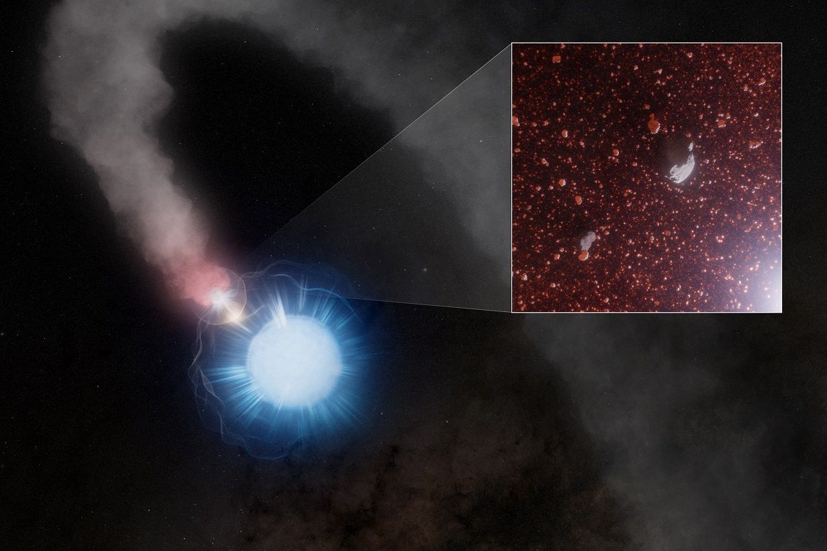 В центре этого открытия, результаты которого были получены благодаря тандему космического телескопа Джеймс Уэбб (JWST) и Атакамской большой миллиметровой/субмиллиметровой антенной решетки (ALMA), находится система WR 112. Это место обитания крайне редкого класса звезд — Вольфа Райе. Такие звезды представляют собой финальную стадию эволюции массивных звезд, которые сбрасывают свои внешние оболочки и выделяют колоссальные потоки звездного ветра, разогнанного до миллионов километров в час. В системе WR 112 этот процесс удваивается: ветер от умирающей гигантской звезды сталкивается с ветром ее звезды компаньона. В областях этого космического столкновения вещество сжимается, остывает, и атомы углерода начинают слипаться, формируя пылинки. Однако новорожденная пыль немедленно подвергается испытанию излучением звезд, которое стремится ее разрушить.